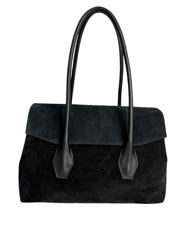 Introducing the Amelia—a sophisticated black suede bag that effortlessly transitions from day to evening. Crafted from luxurious suede, this piece features extended leather shoulder straps that drape beautifully for comfortable carrying. The interior zipper pocket keeps your essentials secure and organized. Perfect for anyone seeking a versatile, elegant accessory that combines timeless style with practical functionality. The Amelia is your go-to bag for making an understated yet impactful statement.