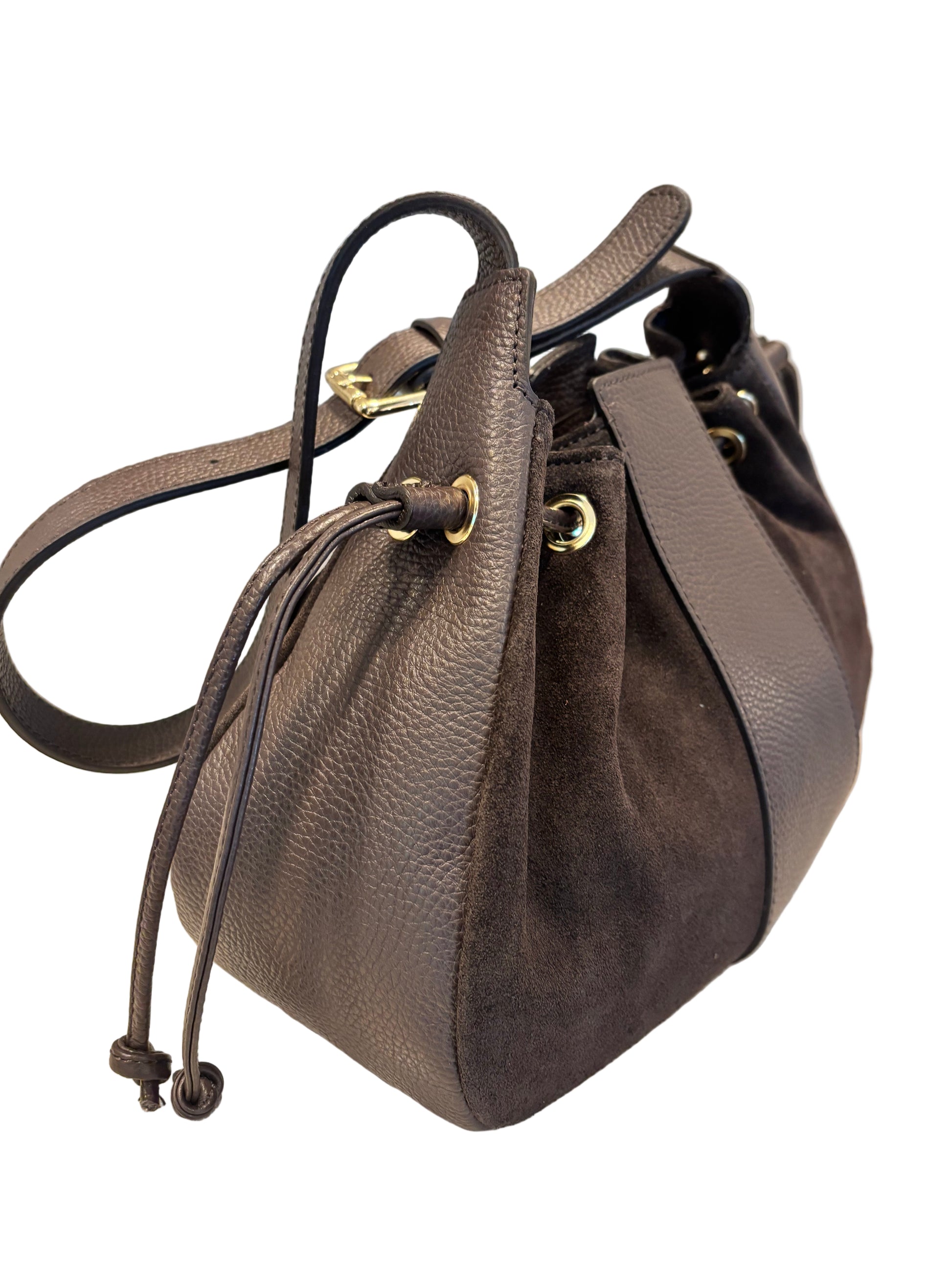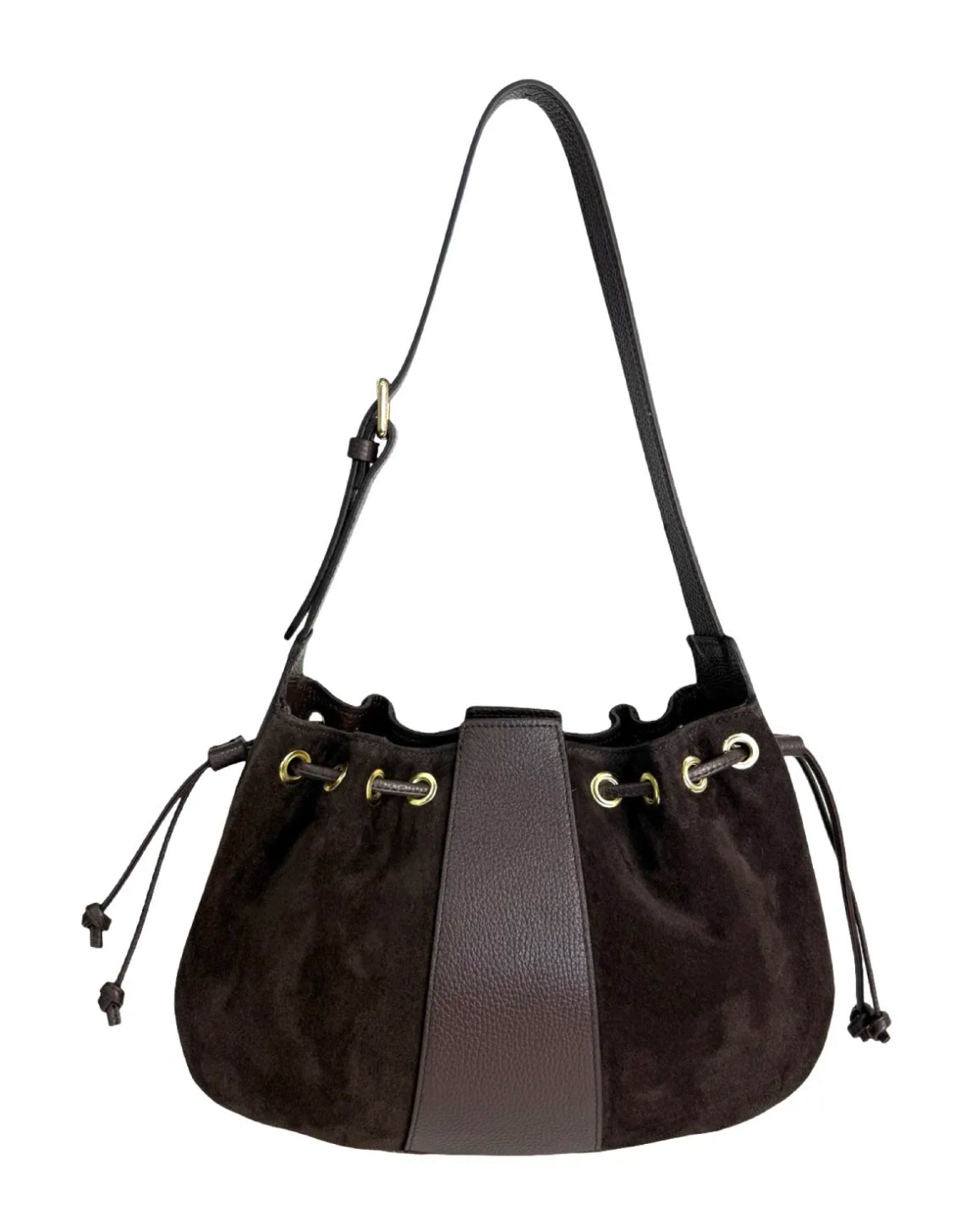 The Blake bag combines luxurious dark chocolate suede and leather for a sophisticated look. Designed with both style and function in mind, it features a secure drawstring and snap closure. The adjustable shoulder strap ensures a personalized fit, while the interior zipper pocket offers convenient storage for essentials. This versatile bag provides expert craftsmanship and practical organization for everyday use.