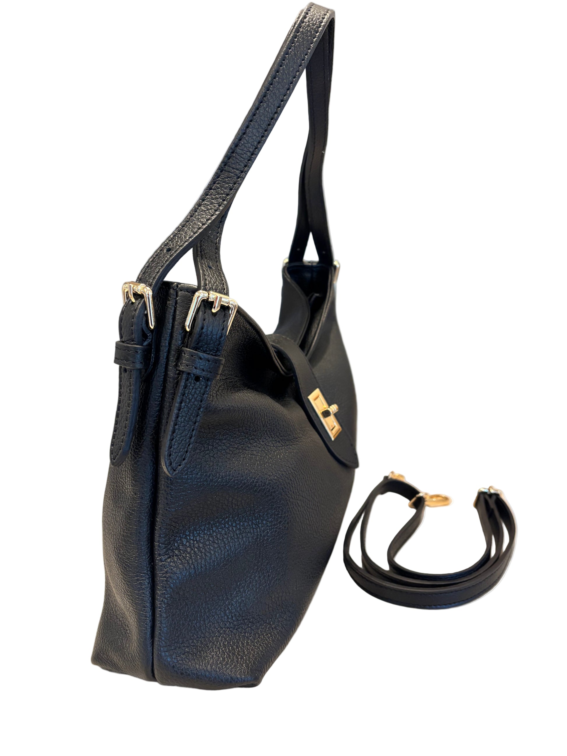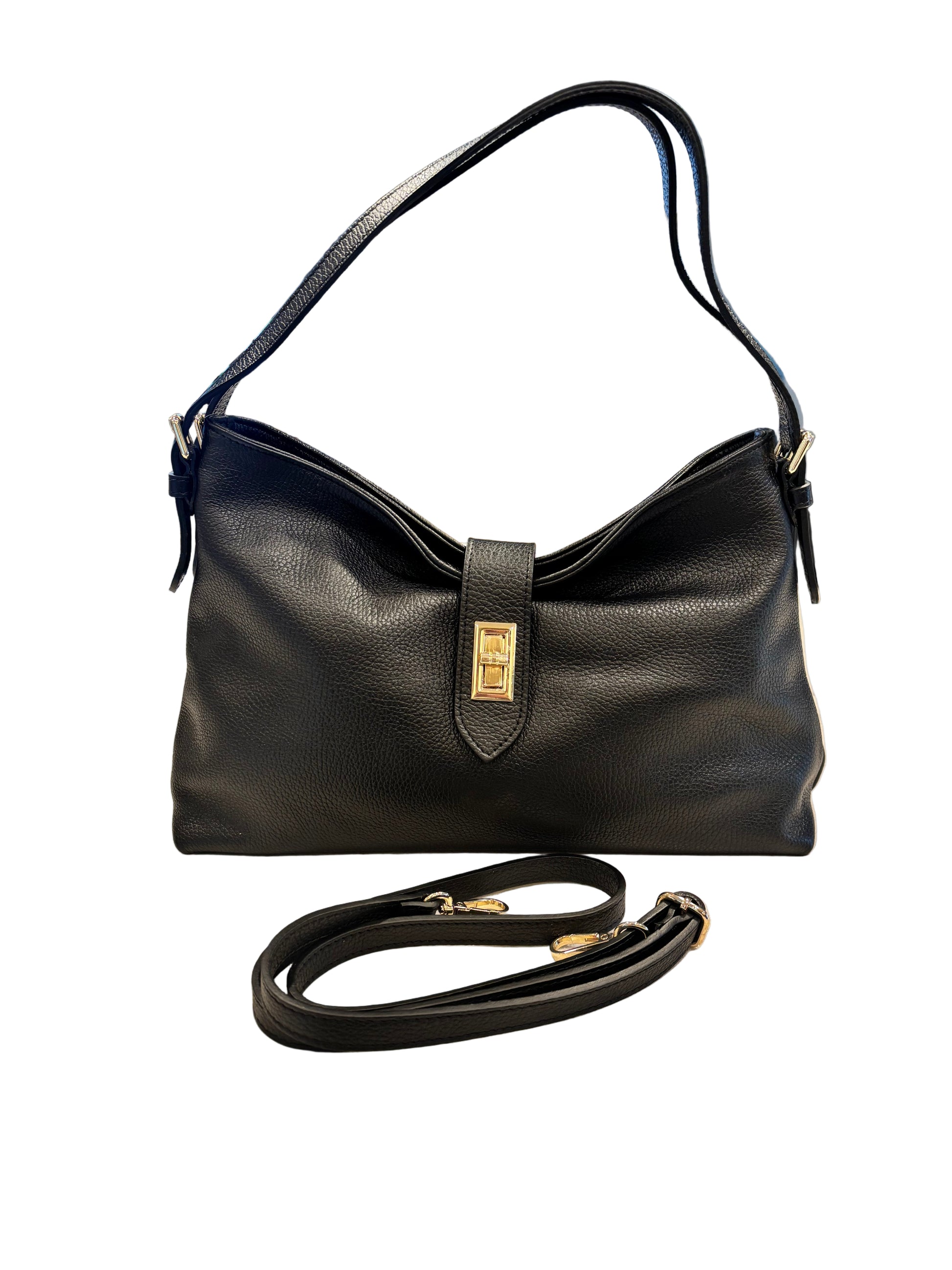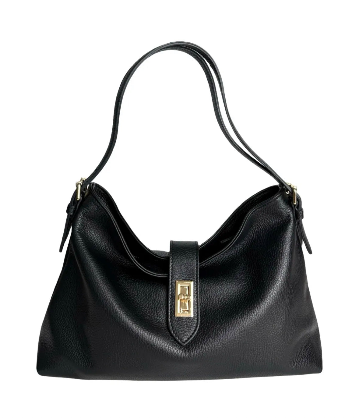The Dylan black leather slouch bag combines style and functionality with its supple leather construction and versatile strap options. Featuring adjustable buckle straps and a convenient crossbody strap, it adapts to your preferred carry style, offering comfort for all-day wear. Its relaxed silhouette provides ample space for essentials, making it a sophisticated yet practical choice for everyday use.