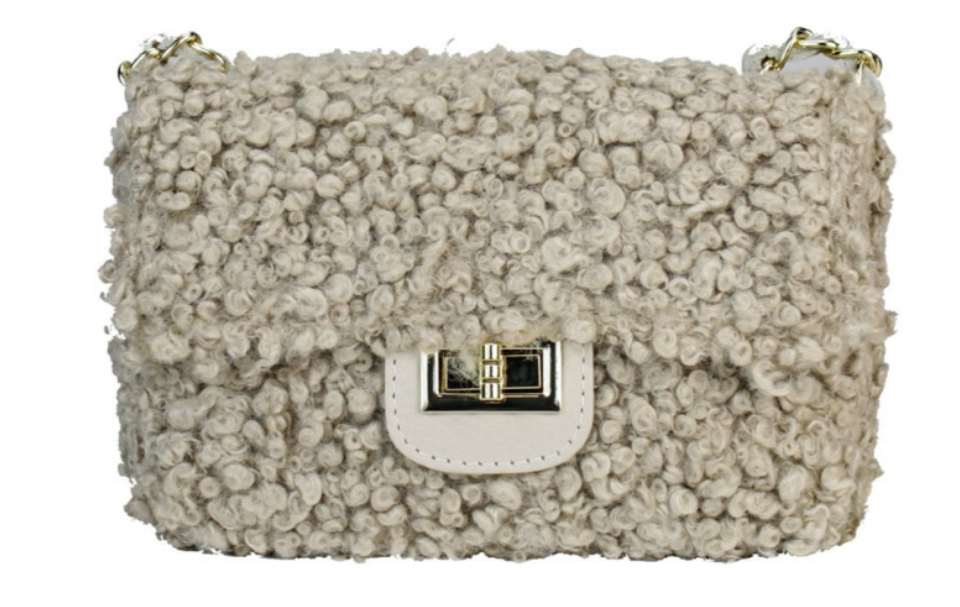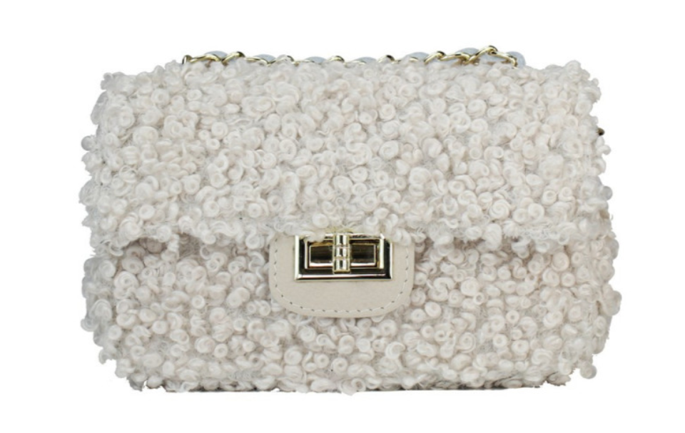The Fifi bag is a playful blend of curly boucle fabric and leather trim, accented with a shiny gold & leather adjustable chain. Inside, a zipper pocket keeps your essentials safe while adding a fun, flirty flair to your style. Perfect for those who love a mix of texture and sparkle!