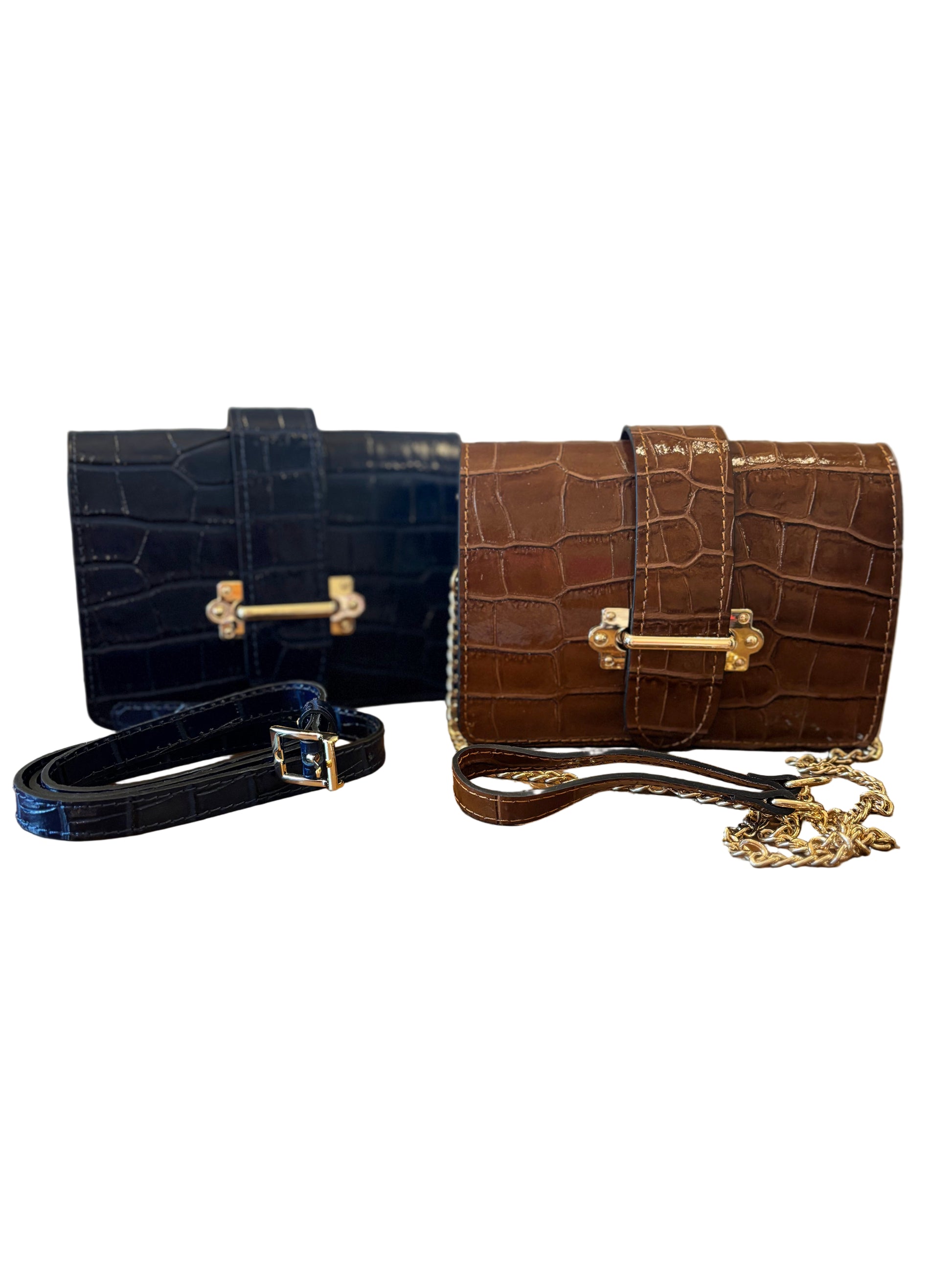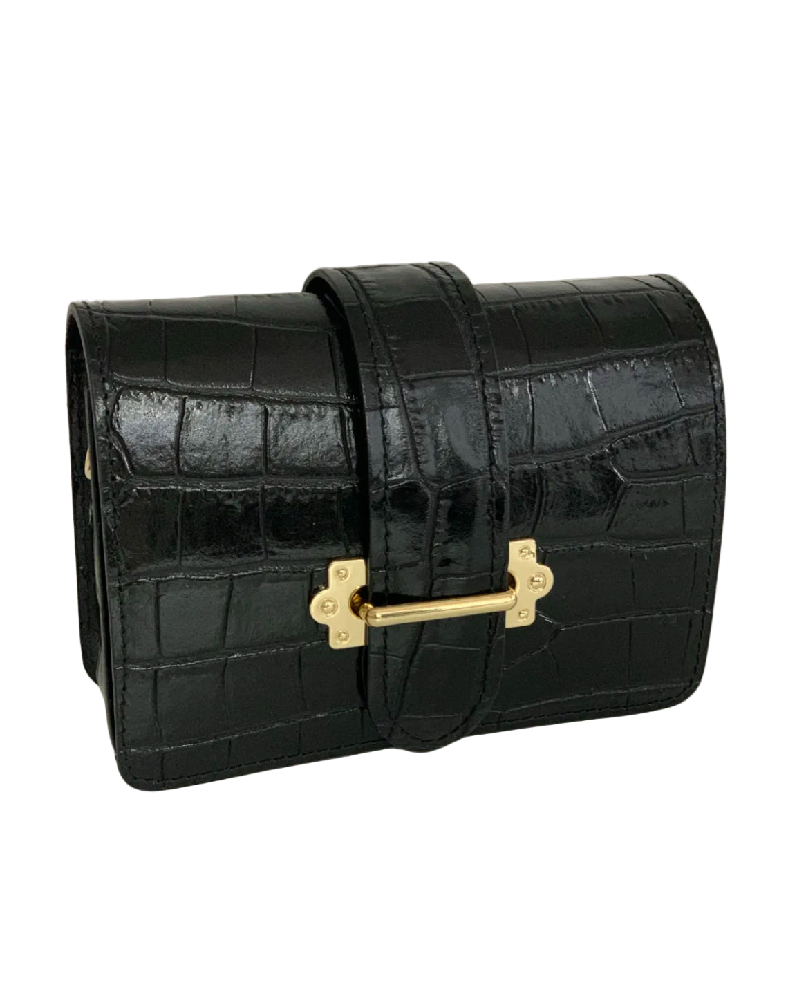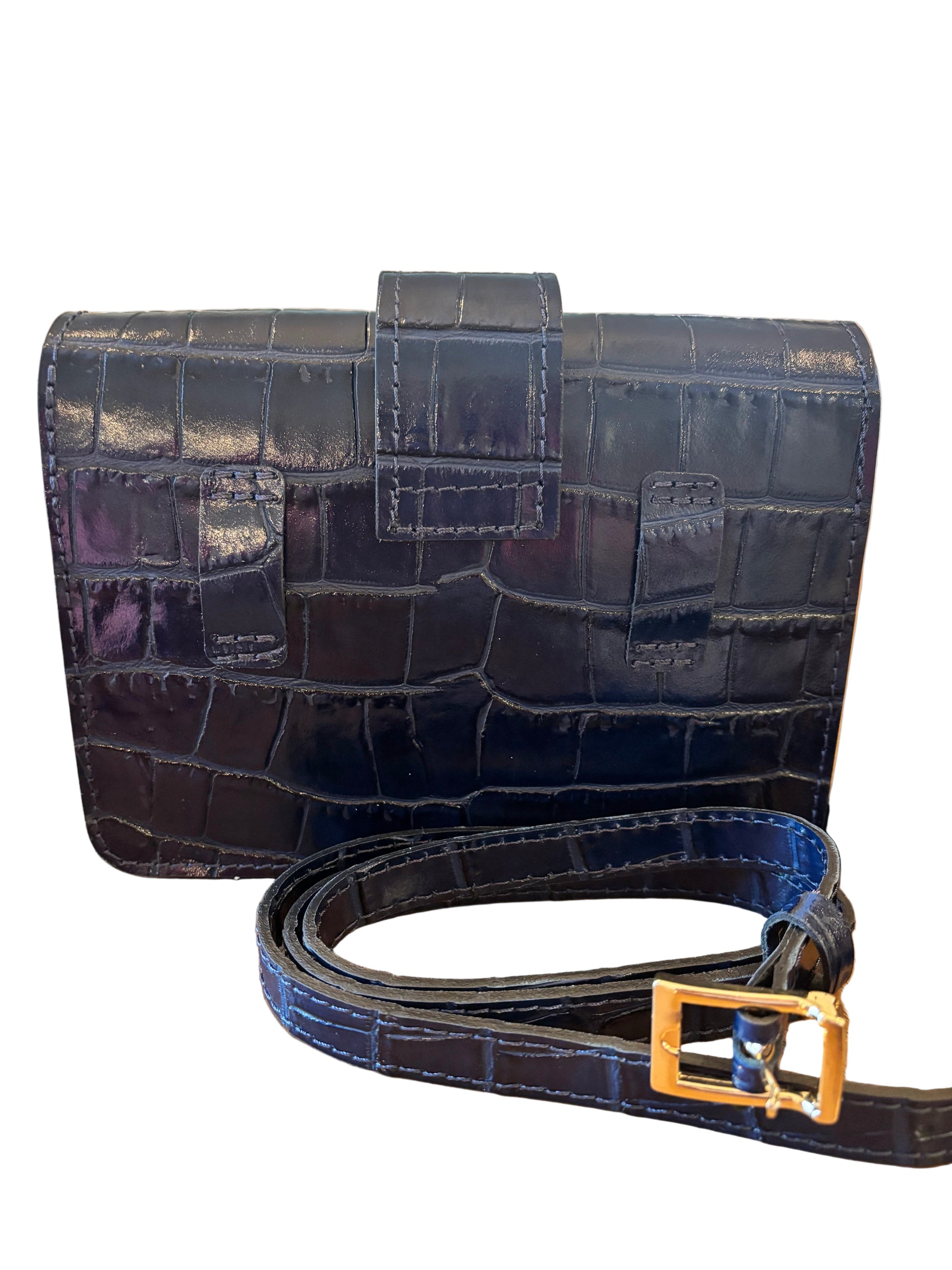 Frida in croc leather is your versatile style sidekick—wear it as a chic clutch, a hands-free crossbody, or a trendy belt bag. The gleaming gold closure adds a touch of sparkle, perfect for turning heads wherever you go. Switch it up and let Frida keep up with your playful spirit!