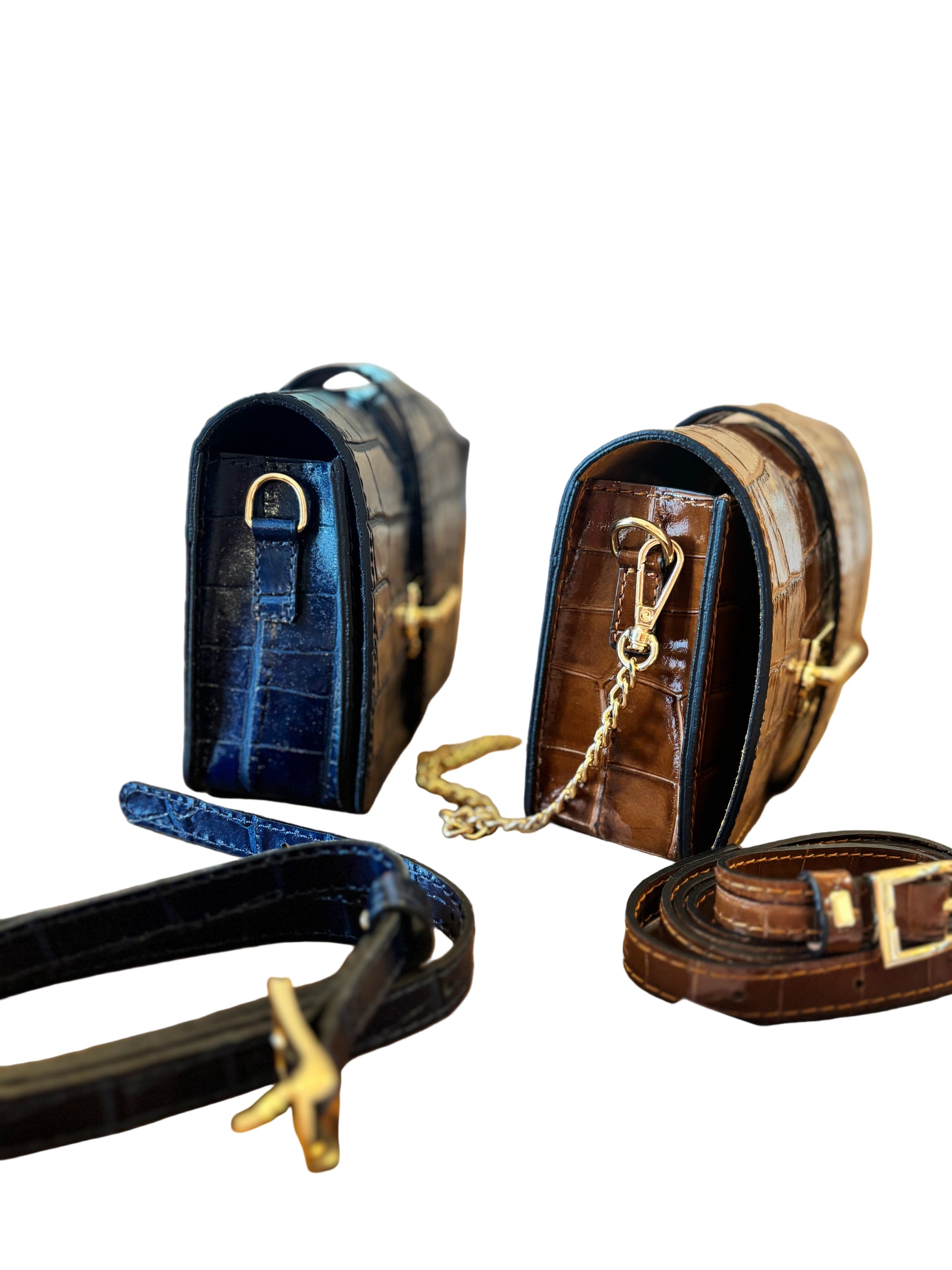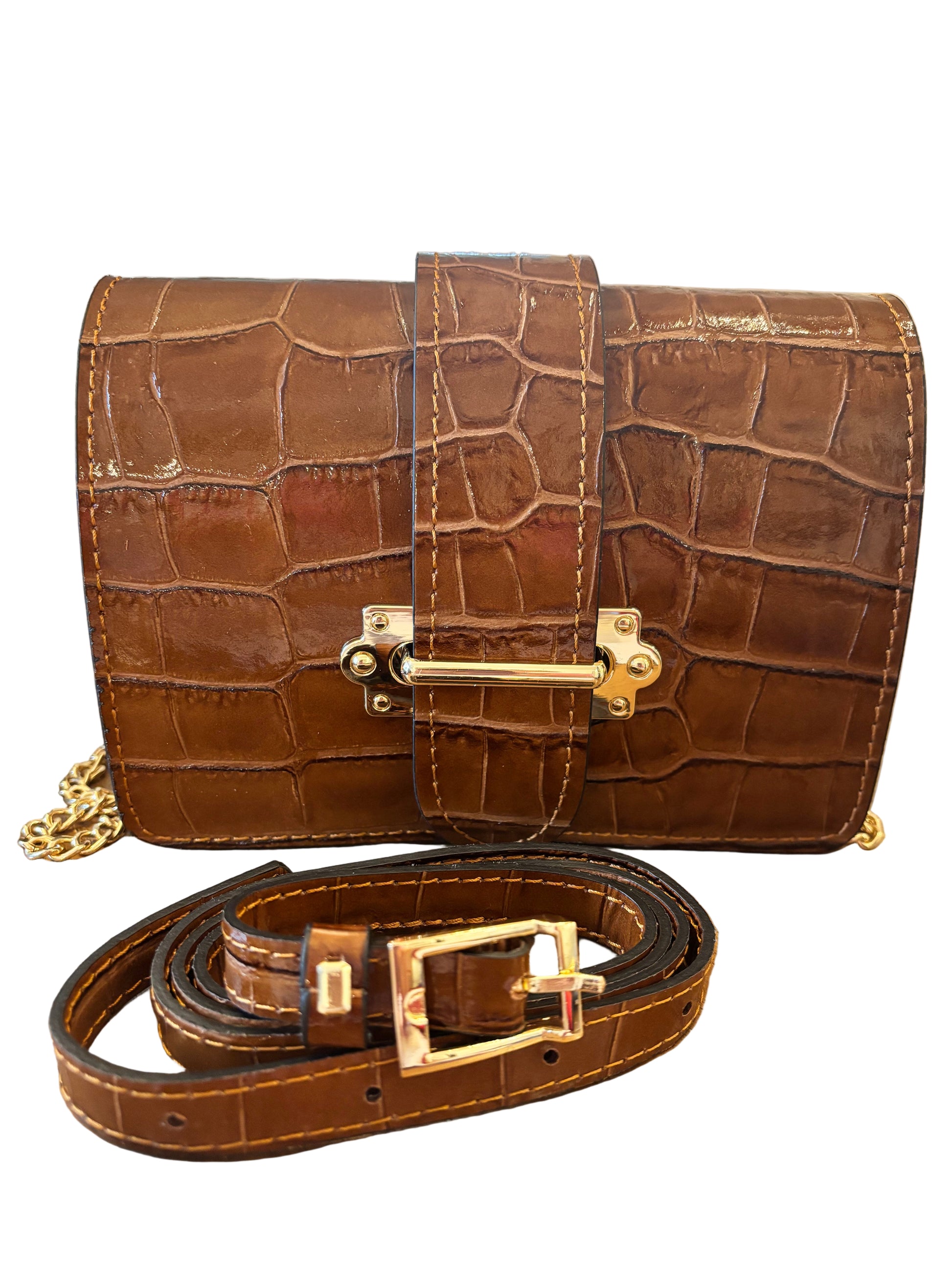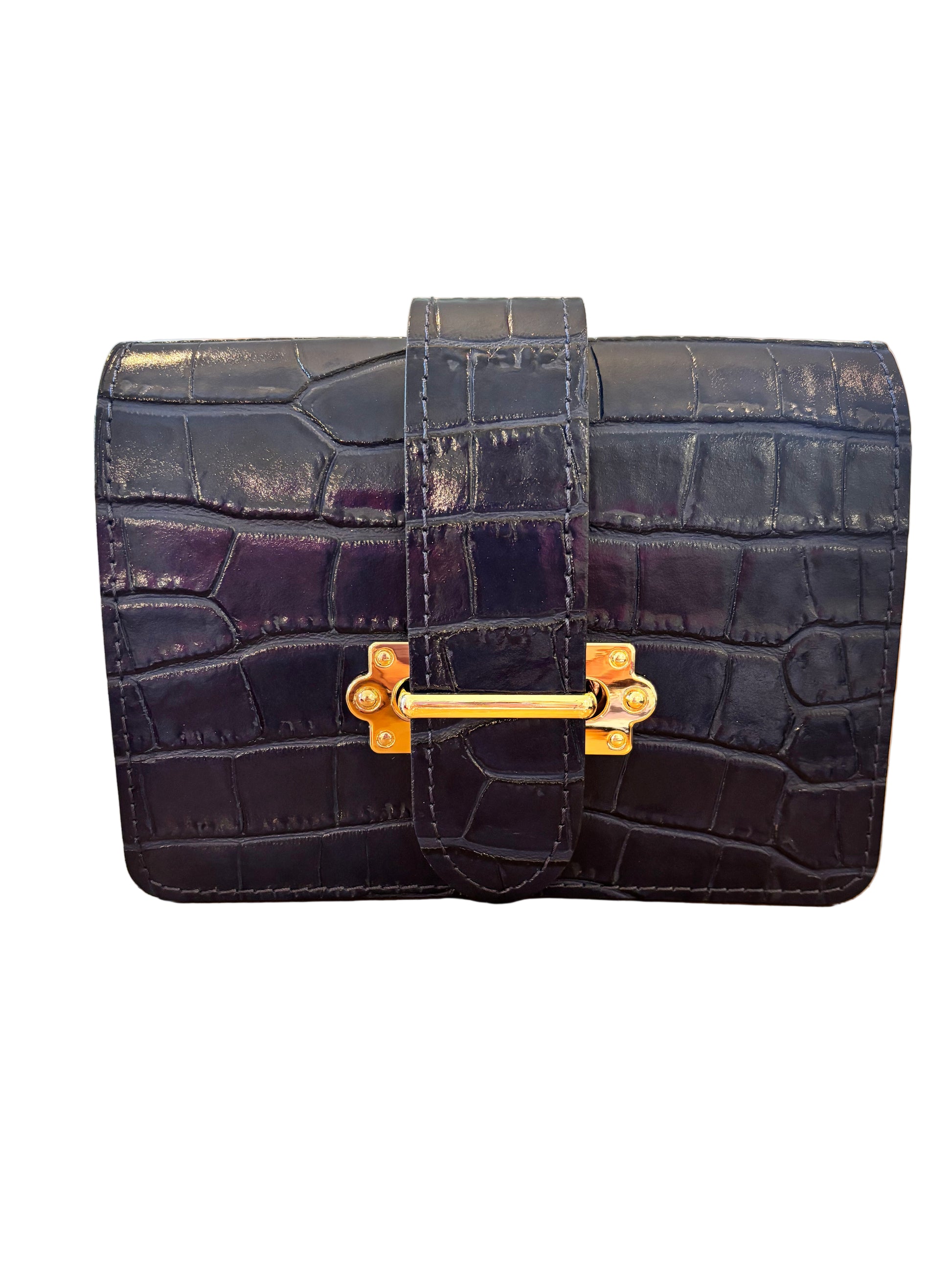 Frida in croc leather is your versatile style sidekick—wear it as a chic clutch, a hands-free crossbody, or a trendy belt bag. The gleaming gold closure adds a touch of sparkle, perfect for turning heads wherever you go. Switch it up and let Frida keep up with your playful spirit!