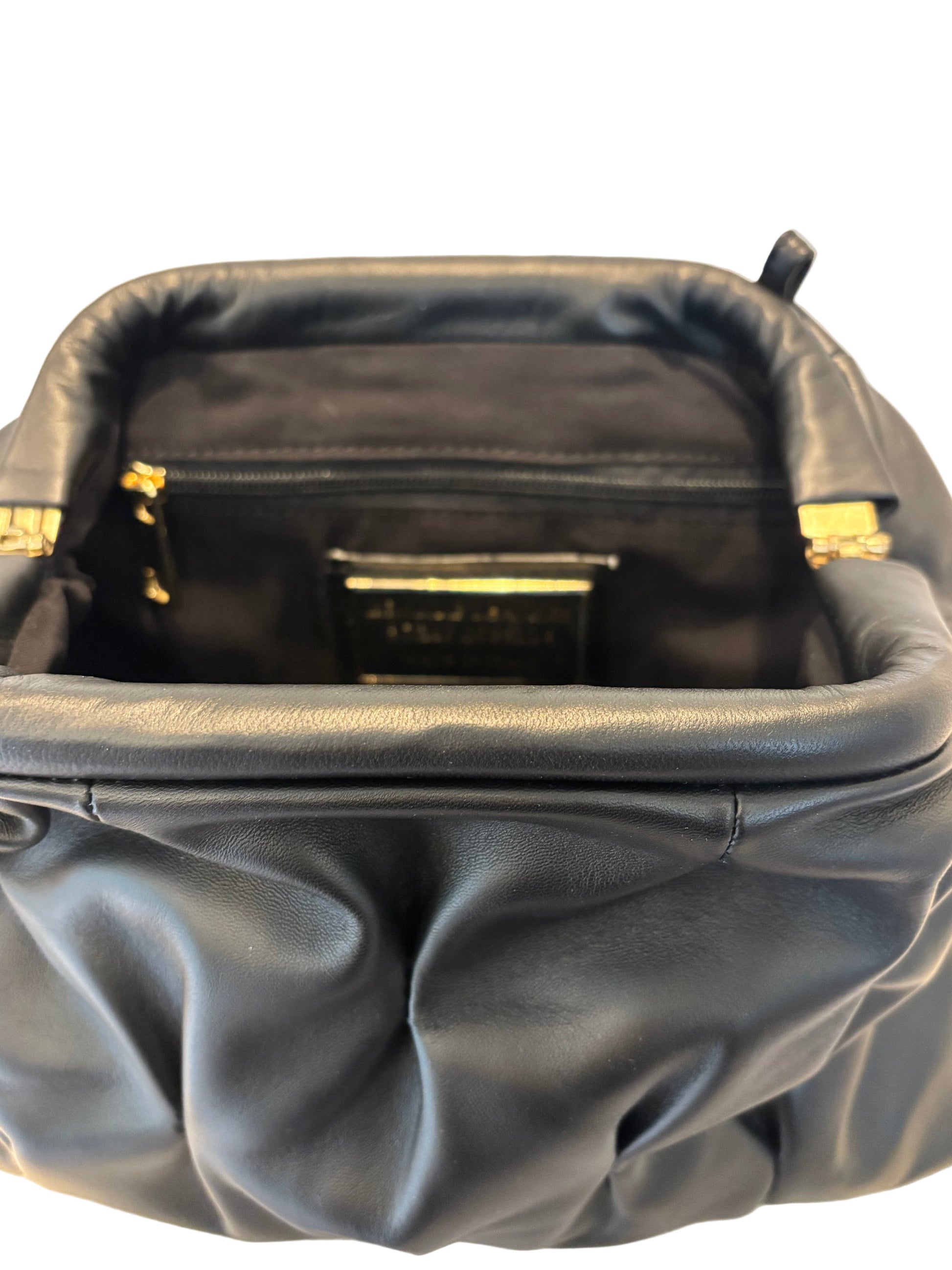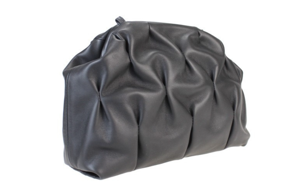 The Giselle clutch redefines versatility with its sleek pintuck design in soft black leather. Hinged closure. Use it as a bold clutch for evening allure or attach the removable crossbody strap for fearless hands-free style. Perfect for those who dare to switch up their look effortlessly.