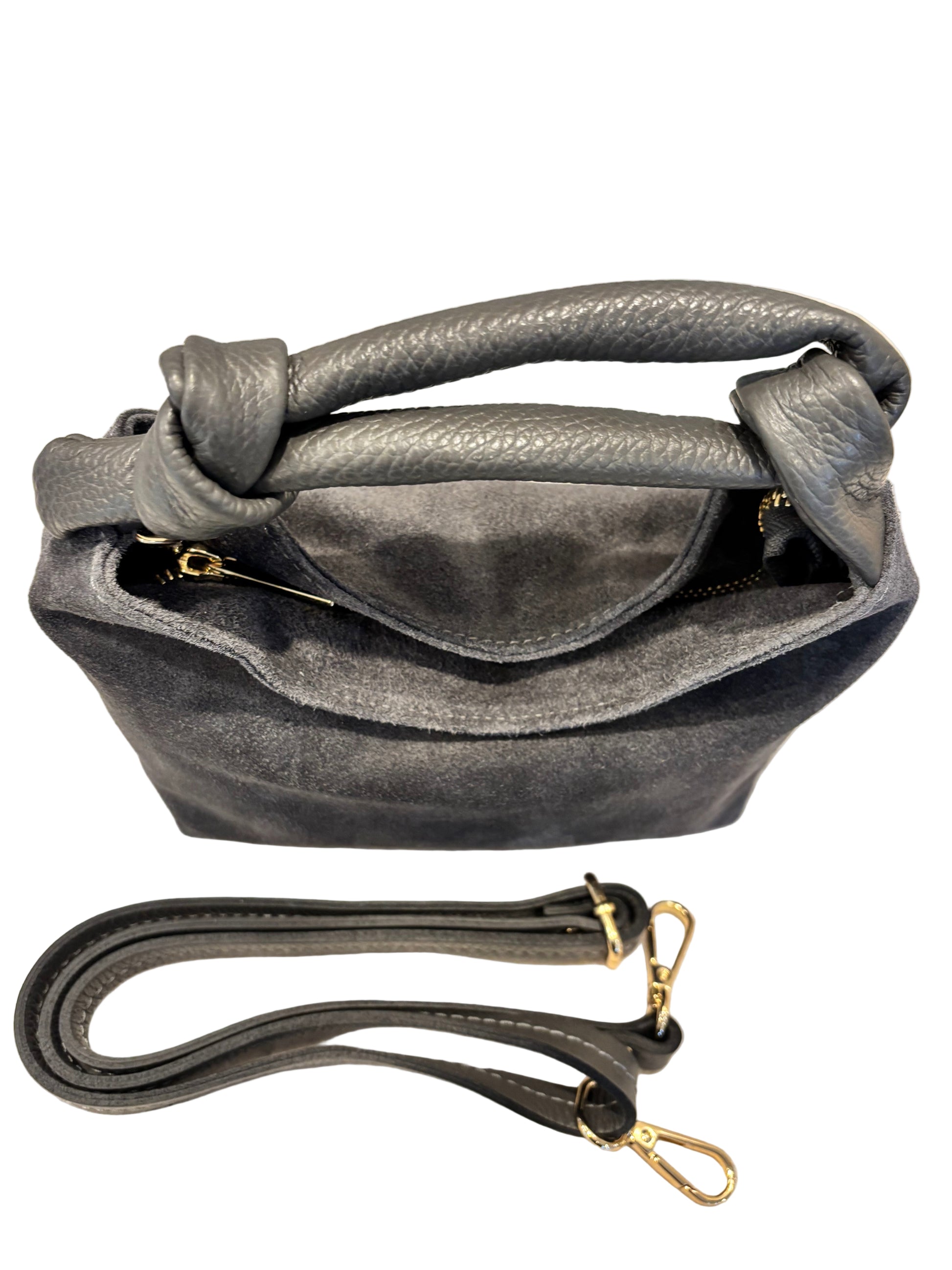 The Juliana bag adds a playful twist to your outfit with its soft gray suede and chic leather knot top handle. Wear it as a crossbody for hands-free fun and let its unique style turn heads wherever you go. Perfect for adding a touch of personality to your everyday look!